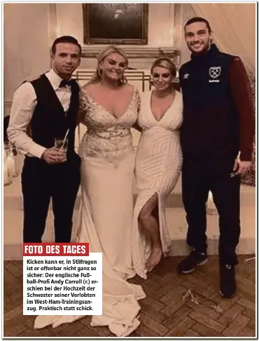 Fieses Mode-Foul bei Hochzeit - England-Profi kam im Trainingsanzug. Andy Carroll 29 von West Ham taucht auf der Feier seiner zukünftigen Schwägerin auf - im Trainingsanzug. De spits werd eind vorig seizoen zonder pardon gedumpt door zijn jeugdclub en moet nog een nieuw team vinden.
